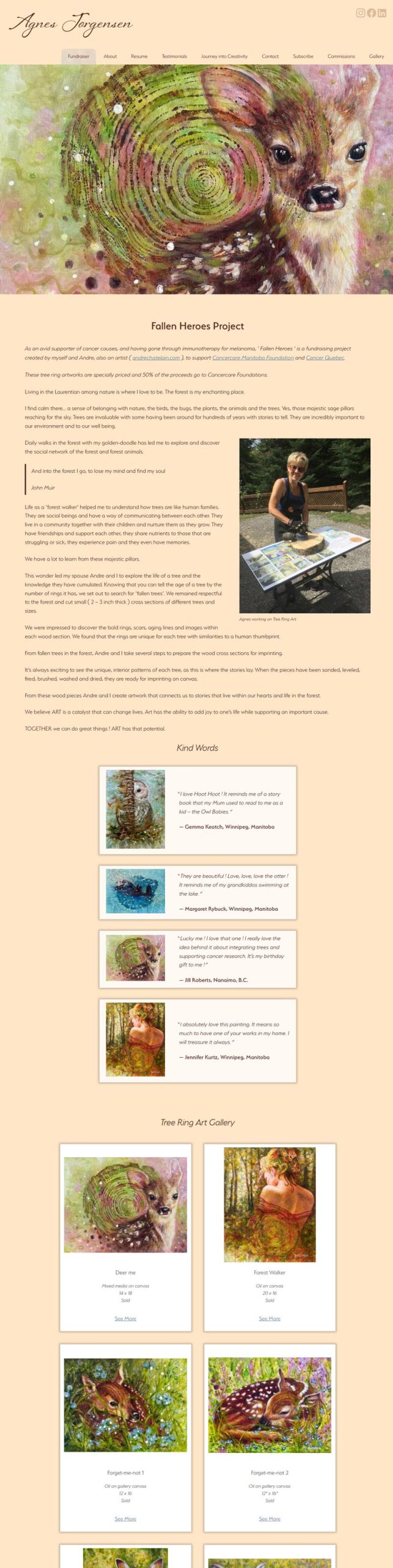 The JorgensenArt.com website beautifully captures the intricate and emotionally resonant work of award-winning artist Agnes Jorgensen, while also effectively promoting her Fallen Heroes Project, a fundraiser supporting Cancercare Manitoba Foundation and Cancer Quebec. One of the biggest challenges in building this site was ensuring that not only was her art showcased in all its detail, but also that her many prestigious awards and recognitions were properly highlighted.