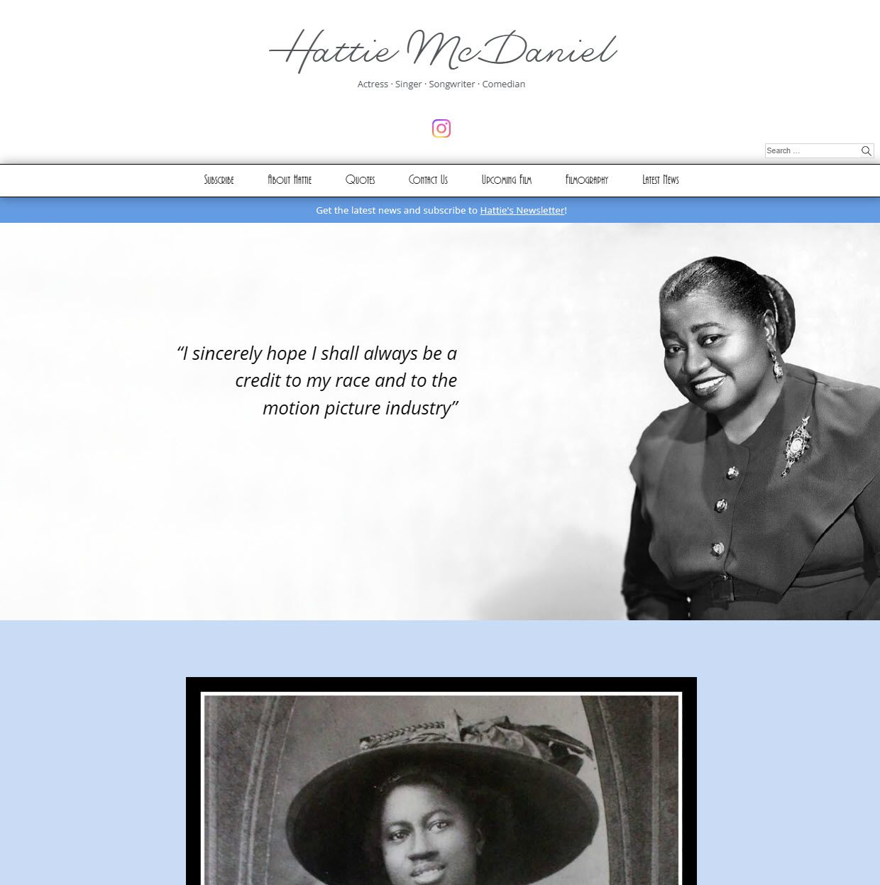 One of the best legacies of Hattie were her quotes, which I highlighted on the home page and created a page full of them. She was also very talented in many fields, so we added a tagline of Actress – Singer – Songwriter – Comedian.